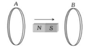 72. In the diagram shown if a bar magnet is moved along the common axis of two single turn coils A and B in the direction of arrow